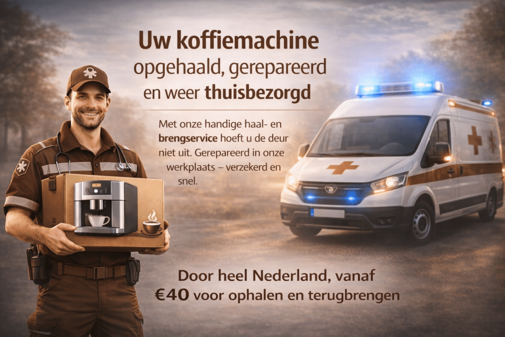 - Bij de Koffie Ambulance profiteert u van een landelijke en voordelige haal- en brengservice. Vanaf slechts €40 halen wij uw (inbouw)koffiemachine bij u thuis op en bezorgen wij deze na reparatie weer netjes terug. Gaat het om een inbouwapparaat? Onze gespecialiseerde koerier demonteert het apparaat vakkundig uit uw keuken en bouwt het na reparatie weer zorgvuldig voor u in.